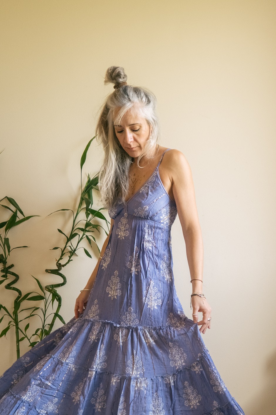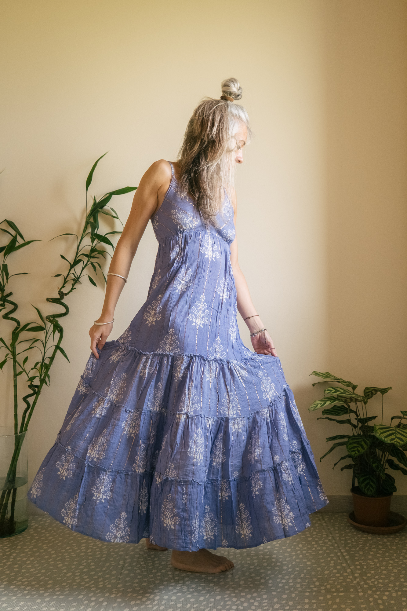Abito Made in India con Laccetti con piccole coccarde di cotone e ricchissimi punti luce Oro. Il tessuto è bellissimo, fresco, corposo e perfetto per la tua primavera/estate.