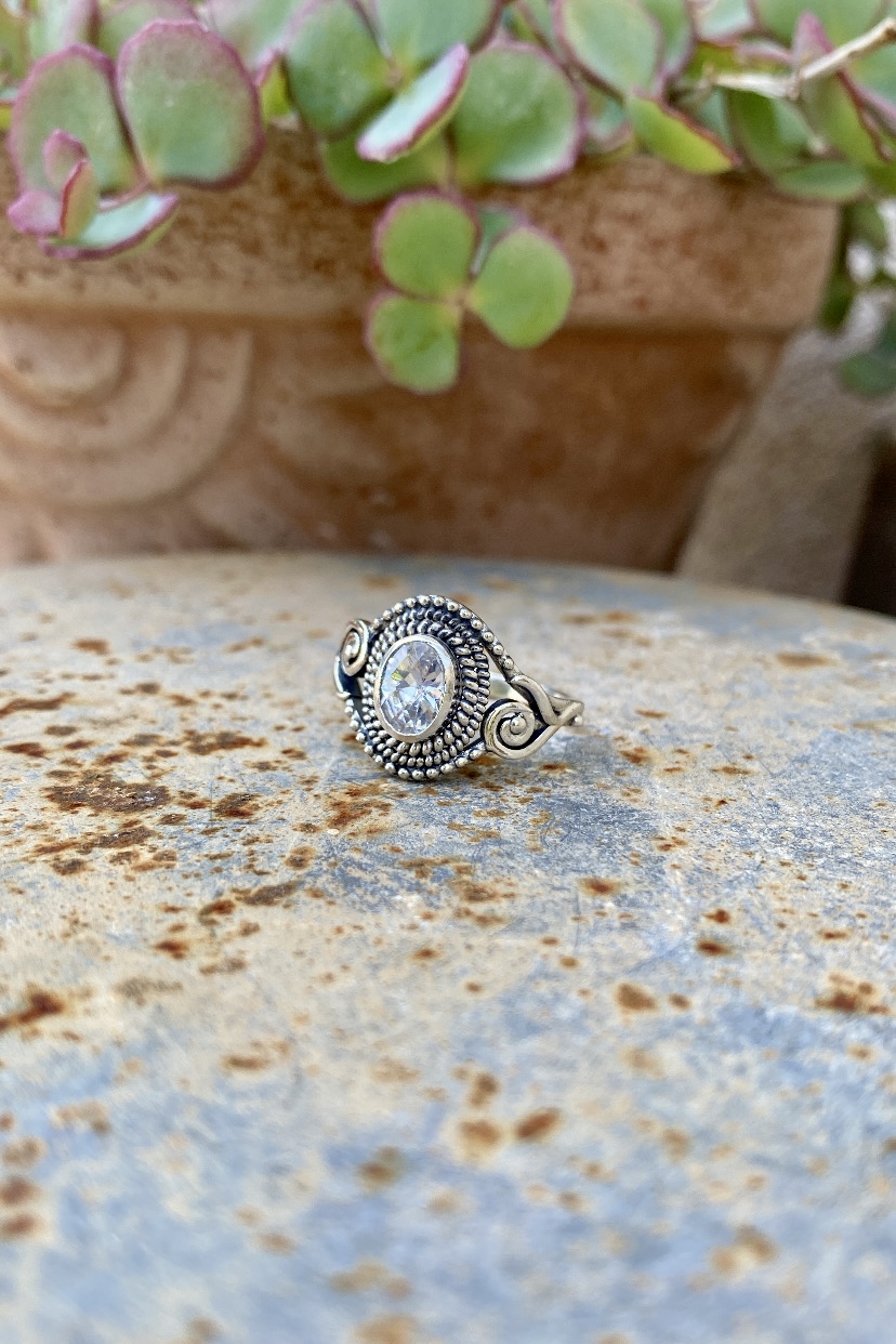 Anello in Argento 925 con pietra e lavorazione a corona intorno alla pietra, che si presenta invece di taglio sfaccettato super luminosa e brillante. ✨ al sole questa pietra brilla tantissimo! L’anello può essere sempre indossato perché non ha nichel e può andare tranquillamente a contatto con saponi ed igienizzanti, non si rovina e non lascia tracce sul dito.