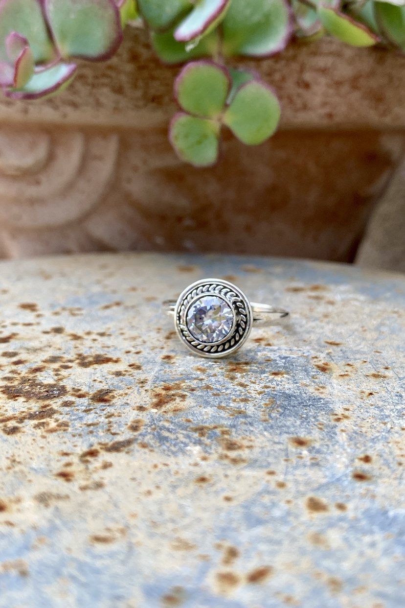 Anello in Argento 925 con pietra e lavorazione a corona intorno alla pietra, che si presenta invece di taglio sfaccettato super luminosa e brillante. ✨ al sole questa pietra brilla tantissimo! L’anello può essere sempre indossato perché non ha nichel e può andare tranquillamente a contatto con saponi ed igienizzanti, non si rovina e non lascia tracce sul dito.