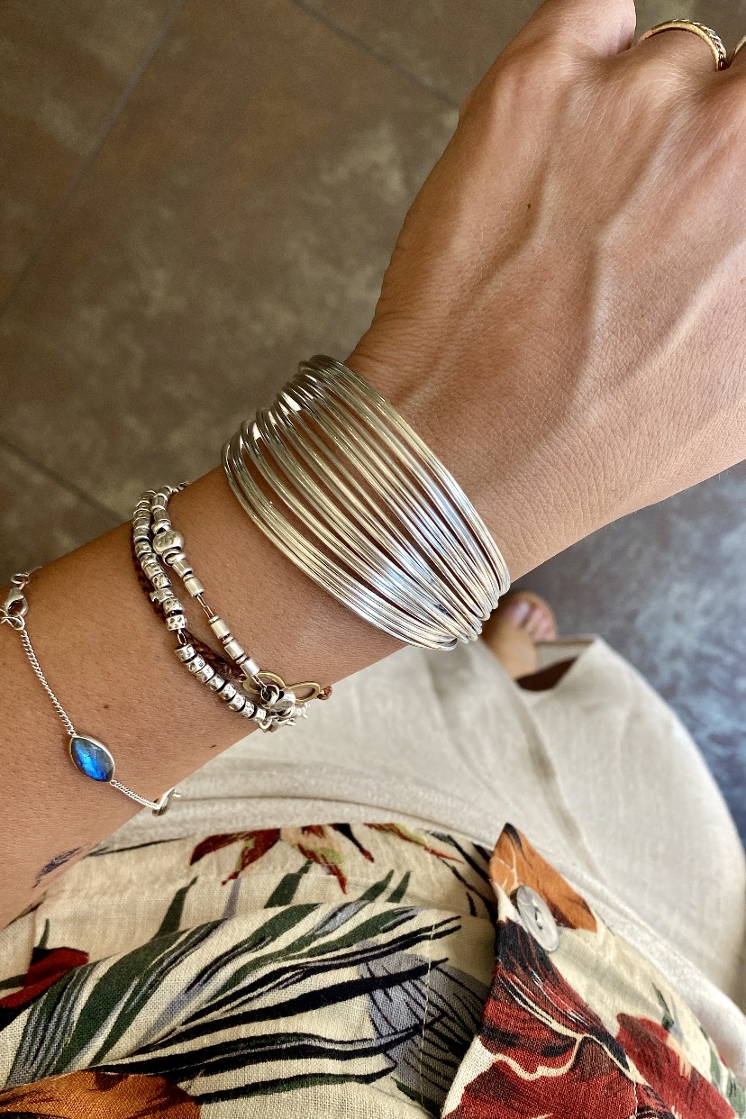 Bracciale in metallo argentato di misura regolabile. Si può stringere e allargare. La base del bracciale è raccolta in una lavorazione tutta handmade, intrinseco di creatività. Il bracciale può essere sempre indossato ma si consiglia di non metterlo a contatto con acqua e sapone per non perdere la placcatura argentata.