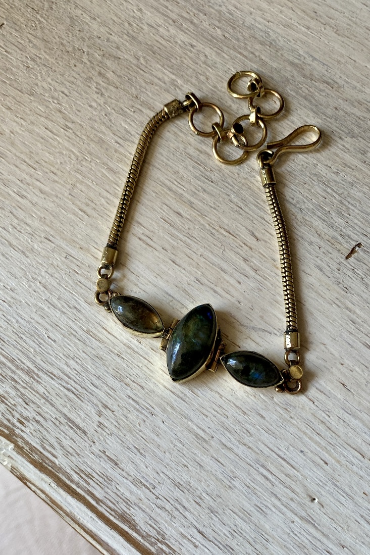 Braccialetto interamente creato in ottone e pietra dura. La pietra si presenta in liscio e cangiante. Il bracciale può essere sempre utilizzato anche a contatto con acqua, sapone, acqua del mare. Leggero, luminoso; facile da abbinare ad altre braccialetti oppure da indossare tutti i giorni da solo. È senza nichel. Se si opacizzasse si può pulire con i prodotti specifici per l’ottone e tornerà subito bello e brillante come il primo giorno!
