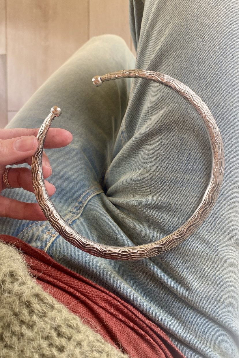 Collana in metallo argentato, senza nichel! Una collana perfetta per tutti gli stili! La sua lavorazione a onde incise regala un bellissimo gioco di chiaroscuro. Il girocollo si apre in modo molto facile, un lato in su e uno in giù. Il prodotto è stato fatto in India.