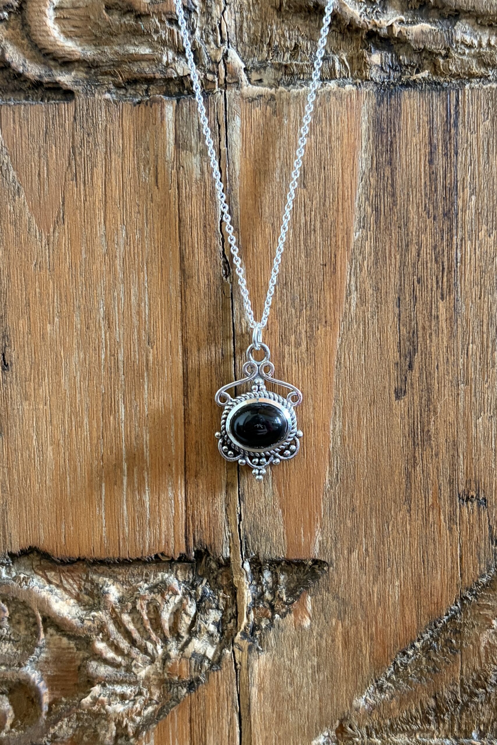 Collana in Argento 925 con ciondolo finale sempre in argento 925 e Pietra Nera intensa, in Onice. La collanina può essere sempre indossata anche a contatto con acqua e sapone: resterà sempre bellissima. La catenina è inclusa e misura 45 cm.